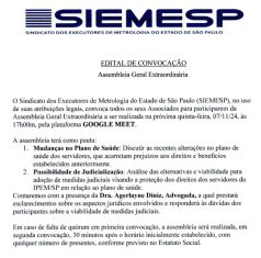 O Sindicato dos Executores de Metrologia do Estado de São Paulo (SIEMESP), no uso de suas atribuições legais, convoca todos os seus Associados para participarem da Assembleia Geral Extraordinária a...